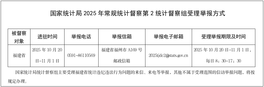 為深入貫徹落實習近平總書記關(guān)于統(tǒng)計工作的重要講話和重要指示批示精神,根據(jù)黨中央和國務(wù)院授權(quán),國家統(tǒng)計局2025年常規(guī)統(tǒng)計督察第2統(tǒng)計督察組日前進駐福建省開展統(tǒng)計督察工作,實地督察時間13天左右。